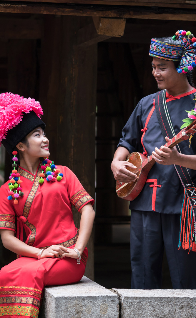 云南壯族主要聚居在文山州,人口114萬,民間的村寨大多依山傍水。壯族擅長種植水稻,有太陽崇拜和長老崇拜的風(fēng)俗,視銅鼓為重器,厚愛銀飾,善烹制五色花米飯,能歌善舞,熱情好客。進(jìn)入景區(qū)壯族村,迎面有祭祀龍王的龍柱,兩邊是先民繪制的天王崖畫和為紀(jì)念傳說洪水泛濫時(shí)幫助先民度過劫難而建的石葫蘆亭。祭祀玉皇大帝的昊天閣和傳說能驅(qū)邪納福的碩大銅鼓聳立在廣場(chǎng)兩側(cè)。桿欄式和麻欄式民居、壯族青年社交休憩的“情廊”、村...